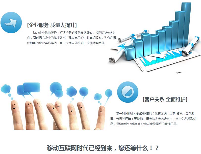 微網(wǎng) WEB APP 輕應(yīng)用為中小企業(yè)快速打造的移動(dòng)應(yīng)用平臺(tái)(APP),幫助企業(yè)快速搶占手機(jī)桌面、 樹(shù)立品牌形象;同時(shí)通過(guò)移動(dòng)應(yīng)用進(jìn)行產(chǎn)品展示、銷(xiāo)售以及移動(dòng)創(chuàng)新?tīng)I(yíng)銷(xiāo)。更重要的是由于手機(jī)移動(dòng)終端 的便捷,為企業(yè)積累了更多的用戶(hù),從而為企業(yè)的創(chuàng)收和未來(lái)的發(fā)展起到了關(guān)鍵性的作用。